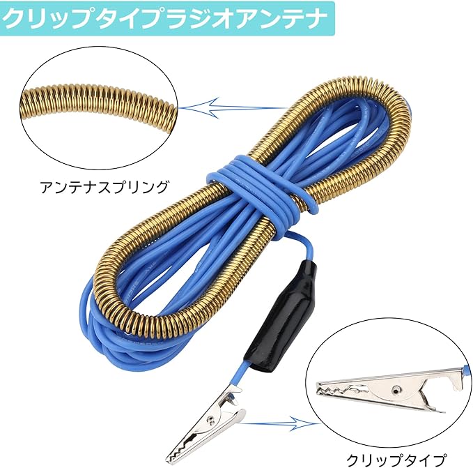 「使い方」1、アンテナスプリングを取り出して、高い位置で固定してください。室内では窓のそばに掛けることをおすすめします。2、柔らかいコードを伸ばしてください。3、アンテナクリップをロッドアンテナヘッドに固定してください。