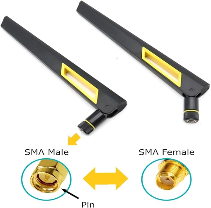 Boost your Wi-Fi! Upgrade your router and/or wireless adapter with high-gain antennas! Specifications:Frequency Range: 2.4 / 5 GHz Wi-Fi bands (2.4 - 2.5 GHz /4.9 - 5.9 GHz)VSWR: <=1.5Gain: 10 dBi (MAX)Polarization: VerticalMaximum Power: 50WConnector Type: SMA MaleColor: Black/GoldLength: 4.3 in / 10.8 cm