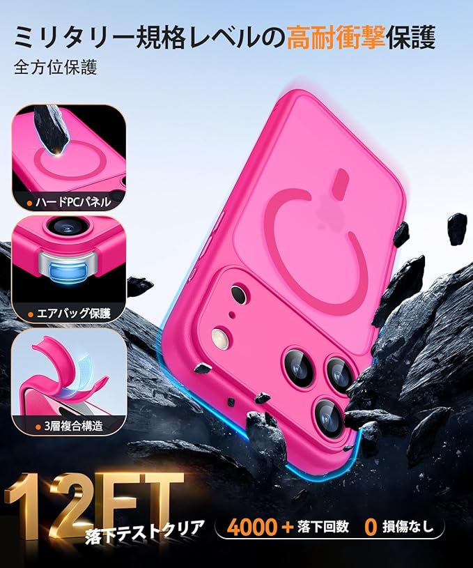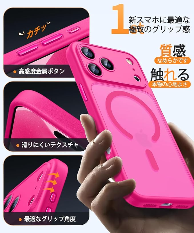 CANSHN iPhone 17 Pro Max 用 ケース Magsafe対応 カメラ全面保護 ワイヤレス充電 あいふおん 17 Pro Max 用 ケース 耐衝撃 エアガードコーナー 傷つき防止 指紋防止 リング マグネット搭載 半透明マット仕上げ アイフォン 17 Pro Max 用 カバー- ホットピンク