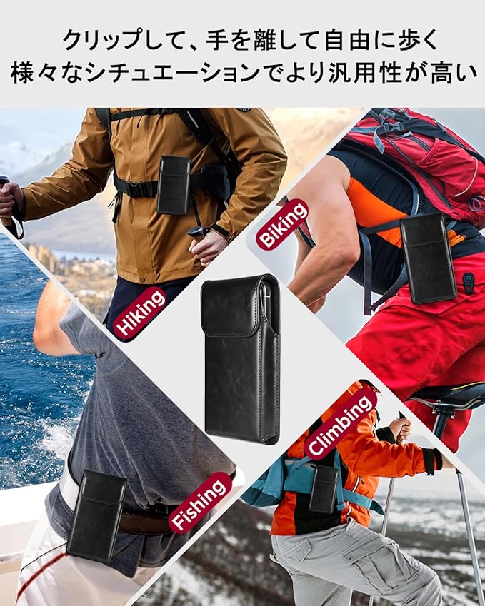 【装着簡単】このスマホベルトホルダーの装着はベルトクリップだけでも簡単にできます。2つのベルトループまで通せばより安定的に装着できます(ベルトの幅:60mmまで対応)。ベルトを直接通せばしっかりと固定できますし、ベルトの頻繁な着け外しがあるときは、クリップ状の金具で挟むだけの装着法を選べ、自由度は高いです。労働者には理想的な設計です。