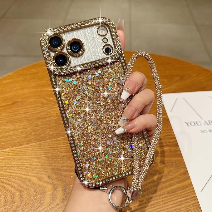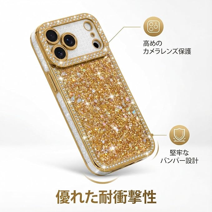 Lafunda 用の iPhone 17 Pro Maxケース キラキラ ラメ スマホケース 女の子 韓国 おしゃれ グリッター リストストラップ サラウンドレンズ保護 軽量 薄型 耐衝撃 ワイヤレス充電対応 用の アイフォン17 Pro Max カバー (ゴールド)