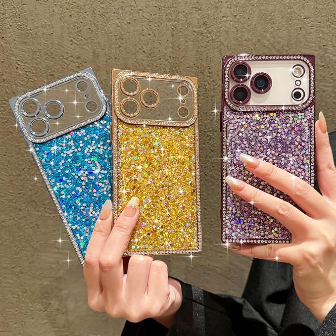LAPOPNUT iPhone 17 Pro Max 用 ケース キラキラ ラメ ラインストーン おしゃれ スマホケース 長方形 直線エッジ 人気 可愛い 耐衝撃 落下防止 軽量 落下保護 衝撃吸収 カバー 携帯ケース(ブルー)