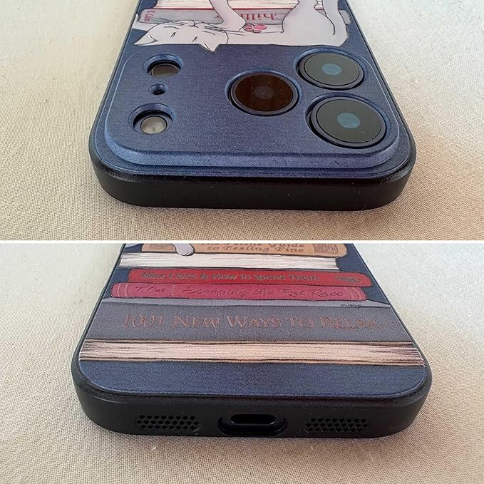 【柄】 積まれた本の上で寝ている可愛いグレーの猫の軽量スマホケースです!15ProMax対応は上部が穴が開いているため柄を下へずらしています。