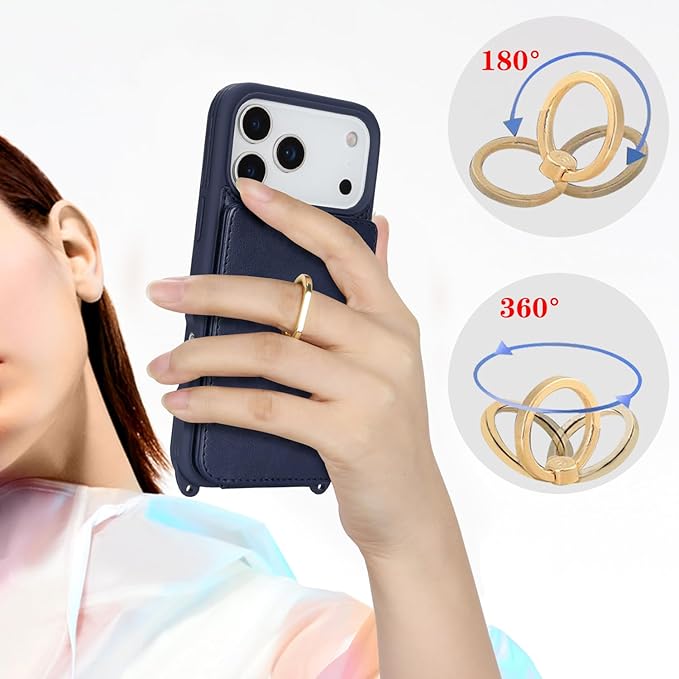 Cavor iPhone 17 Pro Max と互換性があるケース手帳型iPhone 17 Pro Max 用のケースショルダーストラップ クロスボディ肩掛け 首かけ 斜めがけ 背面ポケット付き財布カバー【上下開】iPhone 17 Pro Max 用のケースカード収納【RFID機能】case 360 回転リング 横置磁気機能 落下防止/持ちやすい-ダークブルー