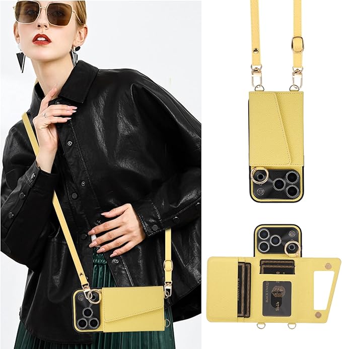 Pelanty 縄掛けケース For iPhone 17 Pro Max 手帳型ケース for iPhone17 Pro Max ケースリング 携帯カバー 肩掛け斜めがけショルダー ストラップ付き PUレザー+TPU アイフォン17プロ Max 背面カバー お札入れ小銭入れ 財布型ICカード収納 スタンド機能 ボタン磁気 耐衝撃 落下防止 イエロー