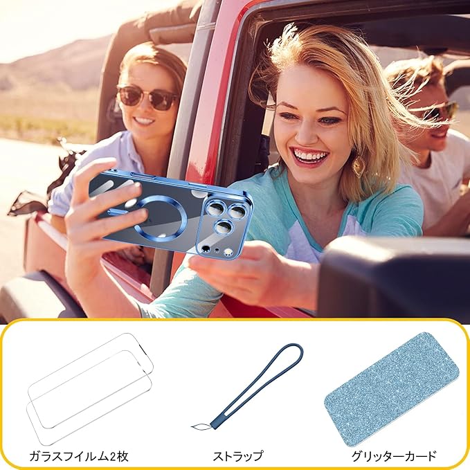 For iPhone 17 Pro Max 用 ケース クリア MagSafe対応 ワイヤレス充電 マグネット搭載 2枚 HDフィルム付き キラキラ グリッターカード ストラップ付き アイフォン 17 プロ マックス カバー マグセーフ対応 薄型 軽量 レンズ保護 全面保護 耐衝撃(ブルー)