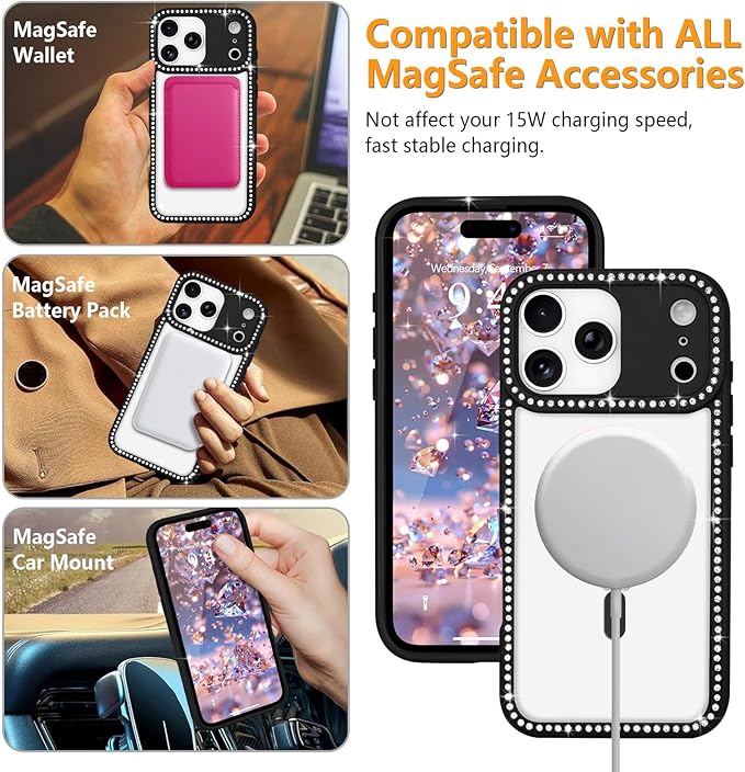 LCHULLE 用の iPhone 17 Pro Max ケース MagSafe 対応 透明 キラキラ ラインストーン かわいいクリア マグネットカバー マグセーフ 対応 女性 韓国 黄ばみ防止 軽量 薄型 耐衝撃 カメラ保護 用の アイフォン 17 Pro Max スマホケース (ブラック)