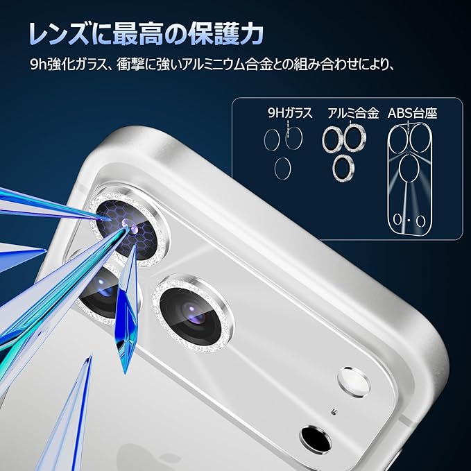 【4代目進化版・透明でキラキラデザイン・全面保護】レンズ部分だけではなく、四角い台座部分もカバーする一体型のデザインで、レンズに最高な保護力を提供しています。台座部分は透明でキラキラするデザインで、お大事なカメラレンズを保護するだけでなく、スマホにもアクセントを加えます!