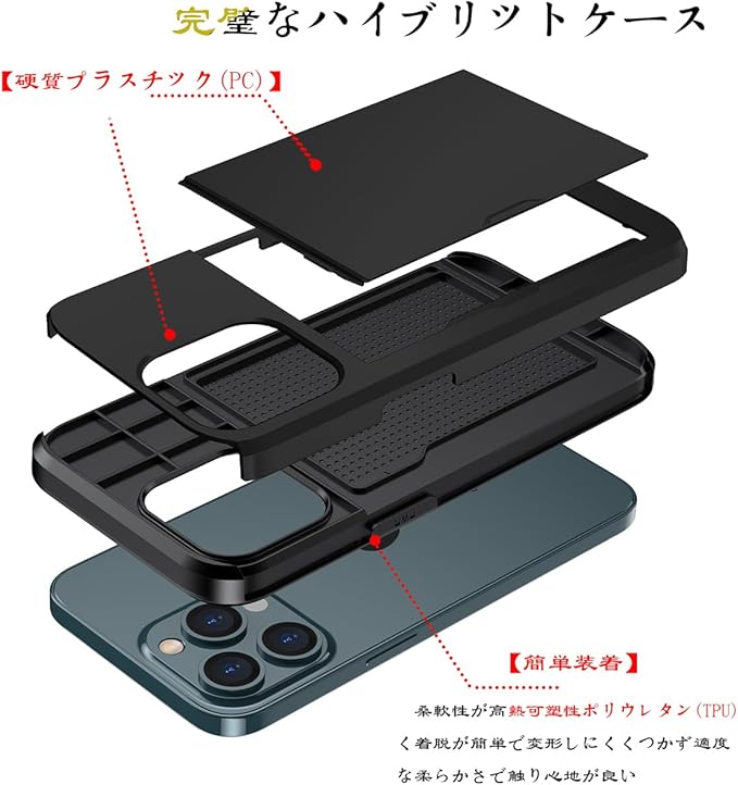 MuZiF iPhone 17 Pro Max 用 ケース カード収納 耐衝撃構造 米軍耐衝撃 全面保護 擦り傷防止 PC 背面収納 アイフォン17 Pro Max用 カバー ケース(iPhone 17 Pro Max用,ブラック)