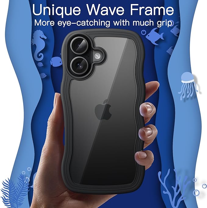 JETech iPhone 17 6.3インチ用 ウェーブ ケース かわいい 波状フレーム うねうね 耐衝撃 スマホカバー 女性用 女子向け クリア ハードPCバック (ブラック)