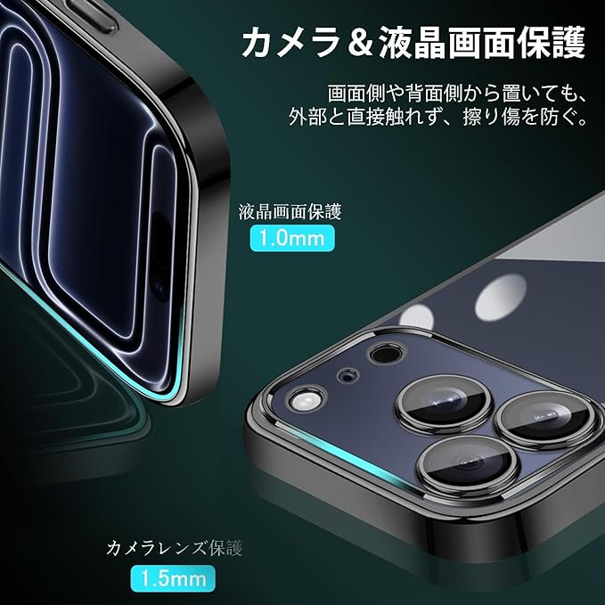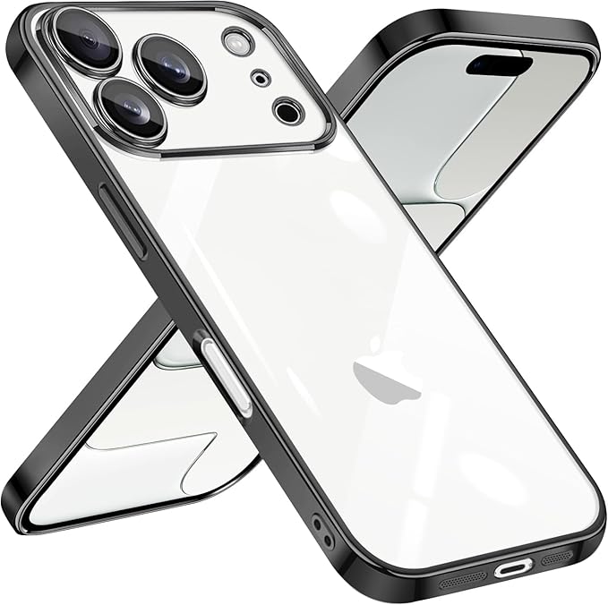 iPhone 17 Pro Max 用 ケース クリア 耐衝撃 iphone17pro max 用 カバー 軽量 薄型 TPU アイフォン 17ProMax 用 スマホケース ワイヤレス充電対応 擦り傷防止 落下防止 ストラップホール付き メッキ加工- ブラック