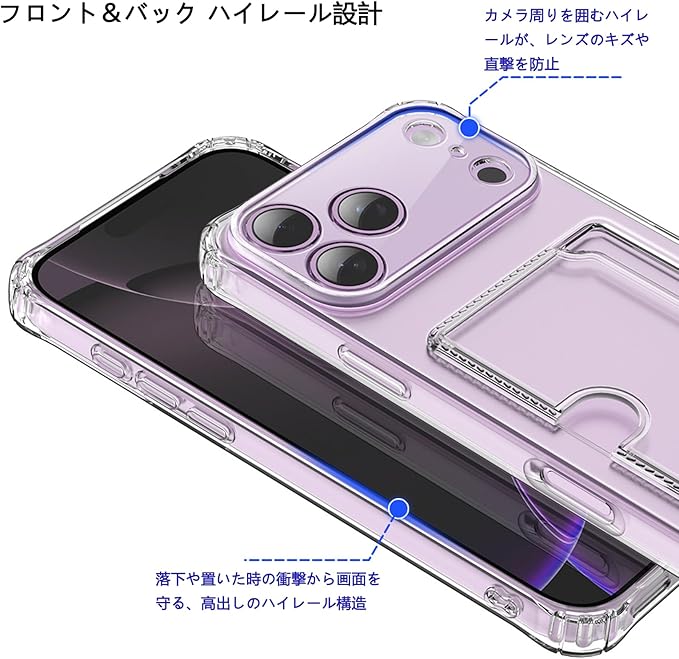 【カードスロット設計】:本体の背面側面部分に専用のカードスロットを設置。日常よく使うカード(交通系ICカード、オートロックカード、キャッシュカードなど)を1~2枚収納できます。透け感のあるクリアバックデザインで、スマホ本体の色や美しいデザインを損なわずにお楽しみいただけます。