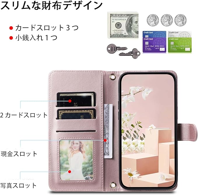 【カード収納 コインケース】iphone 17 pro max 手帳型ケースの内部には3つのカードスロットと1つの空きポケットがあり、交通系カード、日常的に使う銀行カード、写真なども簡単に収納できます。そのため、iphone 17 promax ケース 手帳型 ストラップ は内部に耐磁性干渉材料を使用しているだけでなく、「RFIDブロック機能」などのセキュリティ対策も備えており、重要な個人情報を保護します