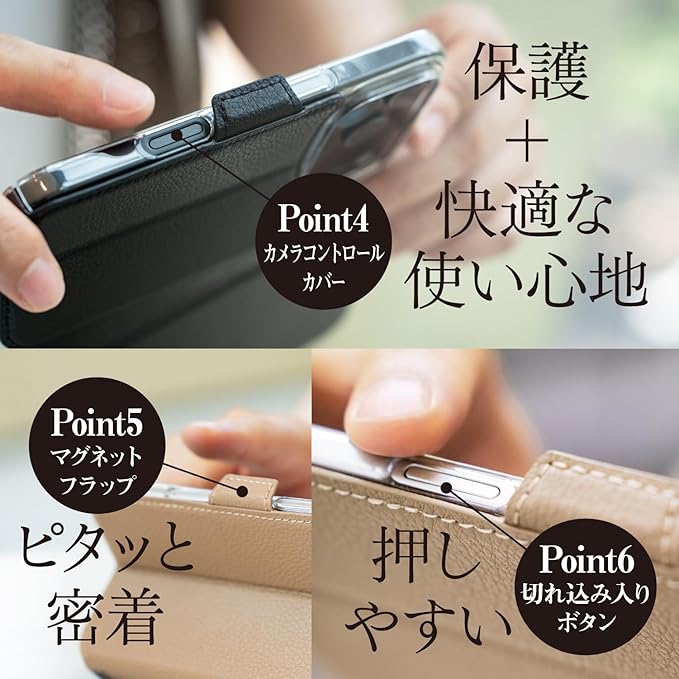 【製品特徴】… ◆ ストラップホール : あり ◆ Qi ワイヤレス充電 : 対応(機器によって非対応の場合あり) ◆ 装着時の本体色 : 見えない ◆ カード収納 : あり(4枚) ◆ 留め具 : あり ◆ スタンド機能 : あり ◆ ガラスフィルム互換性 : メーカーにより一部非対応 ◆ ご注意 : ※ストラップホールを使用の際は、ストラップを持って振り回したり、無理に引っ張ったリしないでください。