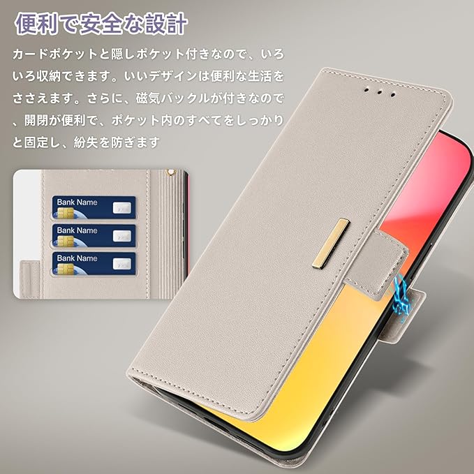 【カード収納】 カードポケットと隠しポケット付きなので、カード、レシート、定期券、名刺などの収納にも優れます。ちなみに、磁気バックルが使えるように、カードを多すぎ入れることをご遠慮ください。[注意:無接触なプライバシー盗難から個人情報を防衛するために、カード入れの内側にRFID自動遮断の素材を採用します。それで、カードをいれたままの読み取りはできません。ご理解をお願いいたします。]※【スタンド機能】 ケースの裏面に折り目を入れ、一瞬でスタンドになります。手に持たず動画の視聴などを楽しむことができます。角度も調整可能です。