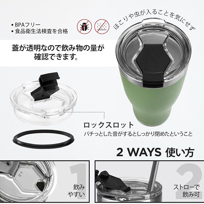 【厳選された材質&BPAフリー】本体は18/8ステンレス鋼で作られ、錆びにくくて耐久性に優れています。結露にならず、熱い飲み物を入れても外側が熱くなりません。蓋はBPA材料を使用せず、無害・無毒であり、安心してご利用いただけます。