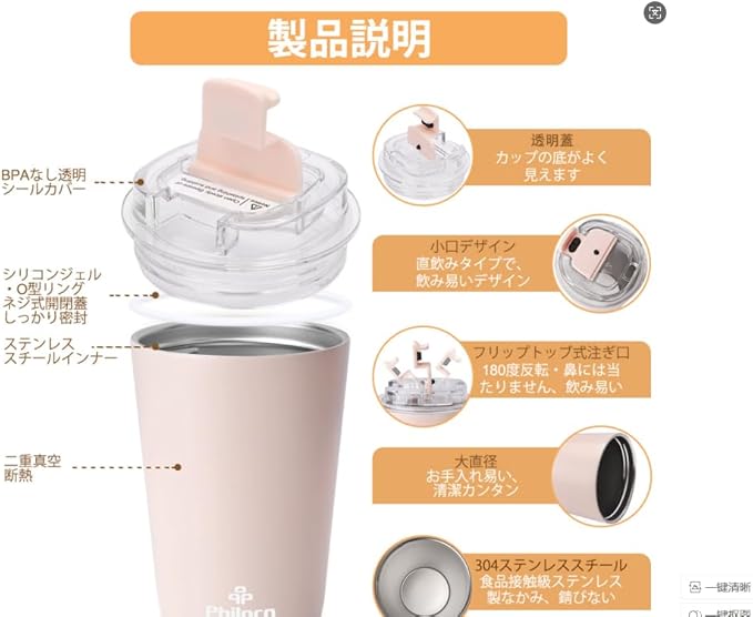 特徴 こぼれ防止, ねじ式蓋, 真空断熱, 結露防止, 車のカップホルダー対応