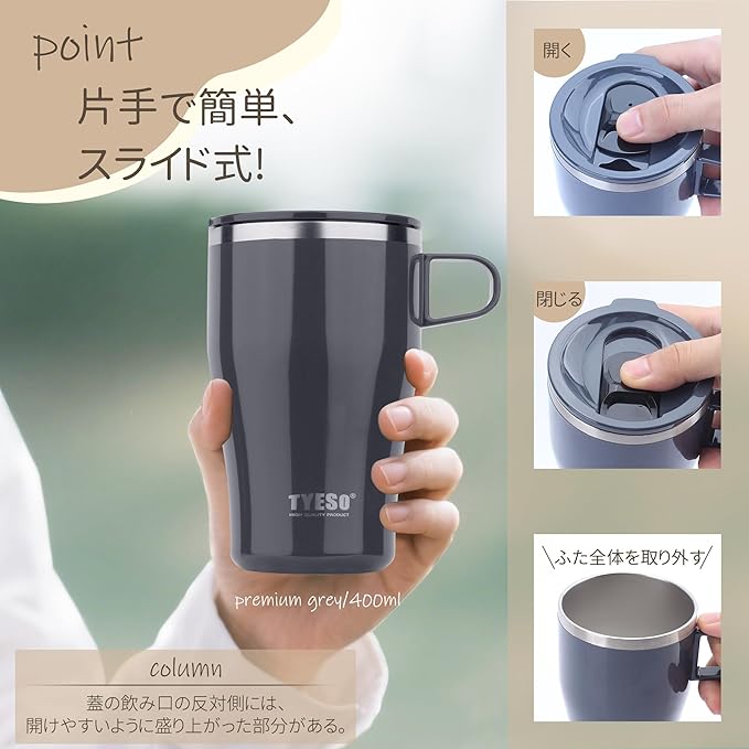 TYESO マグカップ タンブラー 蓋付き ステンレス鋼 真空断熱 大容量 保温保冷 コーヒー カップ 取っ手付き 持ち運び タンブラー プレゼント 500ml TS-8879 灰色