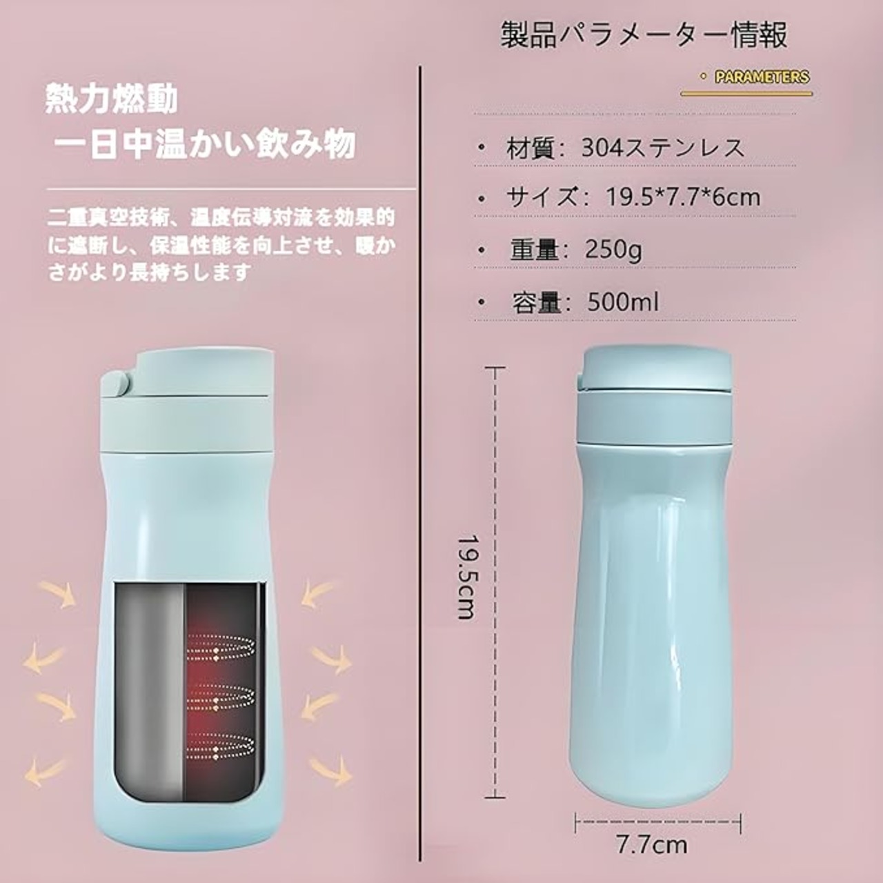 5、タンブラー容量500ミリリットル、サイズ(cm):19.5(H)* 7.7(底幅)* 6(トップ幅)、製品重量0.25キロ。自分用だけでなく、プレゼントとしても人気の高いステンレスタンブラーです。車のドリンクホルダーにピッタリサイズで、携帯性抜群!使用中に何か問題が発生した場合は、お気軽にお問い合わせください。 24時間以内に返信いたします。