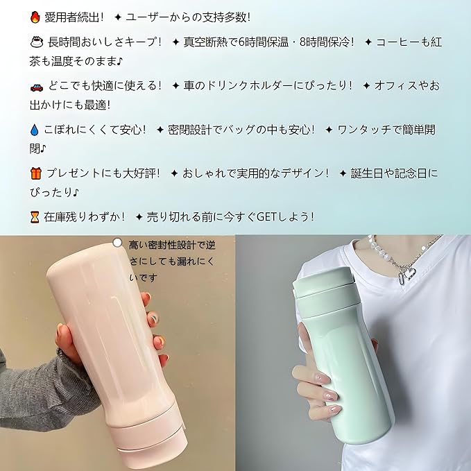 4、タンブラー 蓋付き こぼれない:蓋付きのデザインは、衛生的な開閉ができるフタ、片手で簡単に操作可能です、飲まない時はフタを閉めて、ホコリが入らないようにできます。蓋の開閉がスムーズなので、お手入れも簡単!注:本機をバッグなどに入れるときは、垂直に置いてください。 また、液漏れを防ぐため、蓋がしっかり閉まっていることを確認してください。