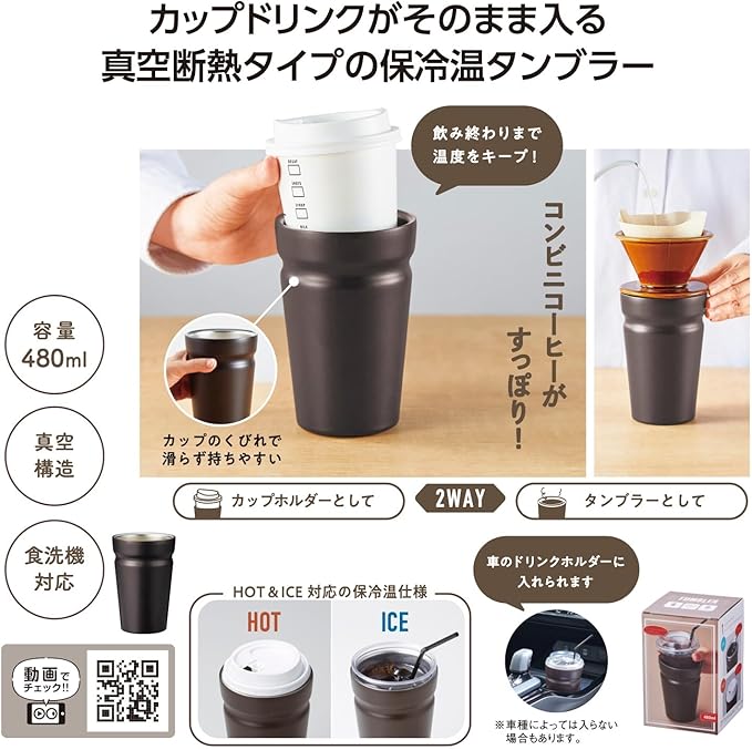 コンビニコーヒー 持ち運び 保温 保冷 タンブラー 真空断熱二層 カップ そのまま で 持ち運び OK 480ml 食洗機対応
