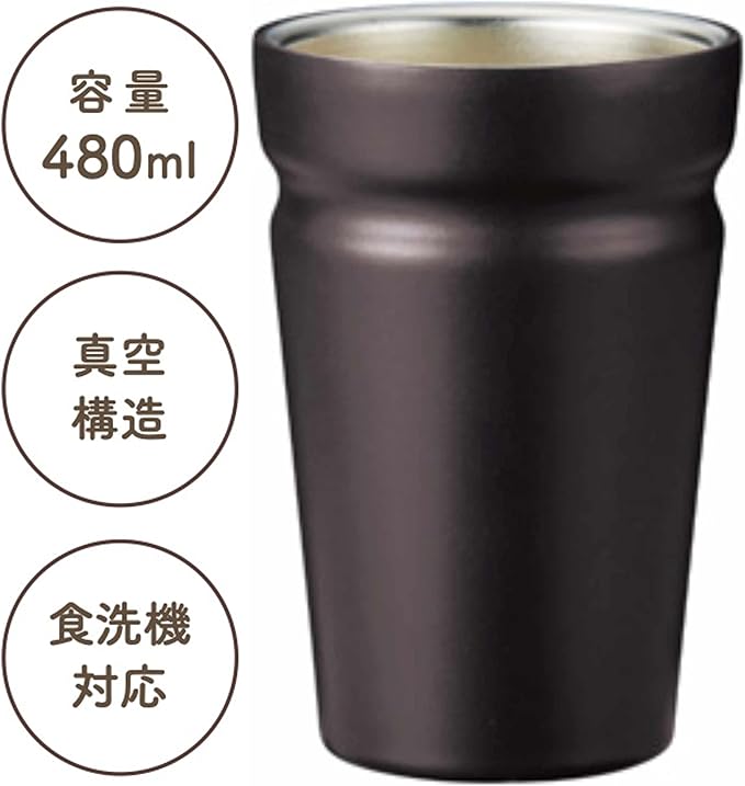 サイズ:φ94 142mm、 容量:480ml 、 素材:ステンレス、 構造:真空2層断熱構造、 対応:食洗機対応OK、 車のドリンクホルダー:ほとんどOK