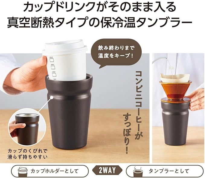 コンビニやコーヒーチェーン店のカップが入る、持ちやすい形状の真空ステンレス製タンブラー。食洗機対応塗装、車内ドリンクホルダー対応。