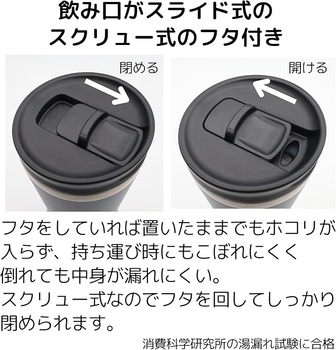 スライド開閉式の、スクリュータイプのフタ付きで、片手でもスマートに飲める真空断熱タンブラー。コンビニやカフェのS~Mサイズカップ(約250〜350ml)にぴったりの350ml容量。