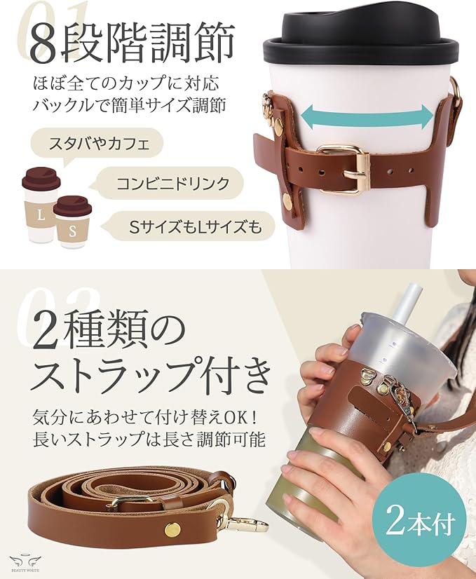 【商品詳細】 〇サイズ:《カップホルダー》飲み口直径6.5cm~9.5cm 調節可能《ロング》長さ118cm~151cm 調節可能、幅1.7cm《ショート》長さ45.5cm、幅1.7cm 〇素材:PUレザー 〇重量:《カップホルダー》31g《長いストラップ》53g《短いストラップ》20g 〇セット内容:カップホルダー、ストラップ(長短2本セット) 〇ブランド:BEAUTY WHITE