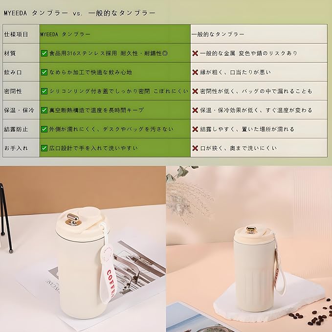 【錆びにくい良質ステンレス】MYEEDA タンブラー 蓋付き こぼれない 450ml ステンレスタンブラー コーヒー 真空断熱 漏れない 大容量 車 洗いやすい こぼれない 持ち運び 保温杯 ビール 手を入れて洗える水筒 可愛い おしゃれ コンビニ coffee mug 大きい 保温 保冷 密閉 咖啡杯 (ホワイト)