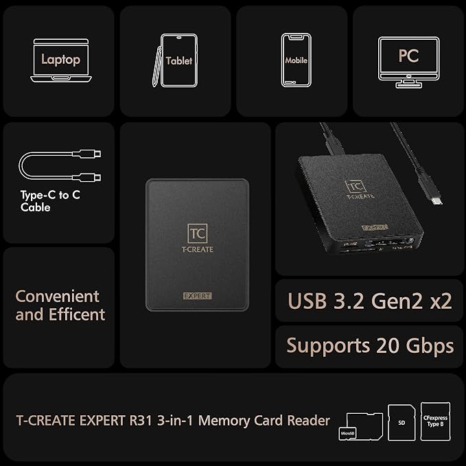T-Create Expert R31 USB Type-C 3.2 Gen2 x2 転送速度は最大20Gbps。MicroSD、SD、CFexpressタイプBメモリカードリーダーTWR31B03用。