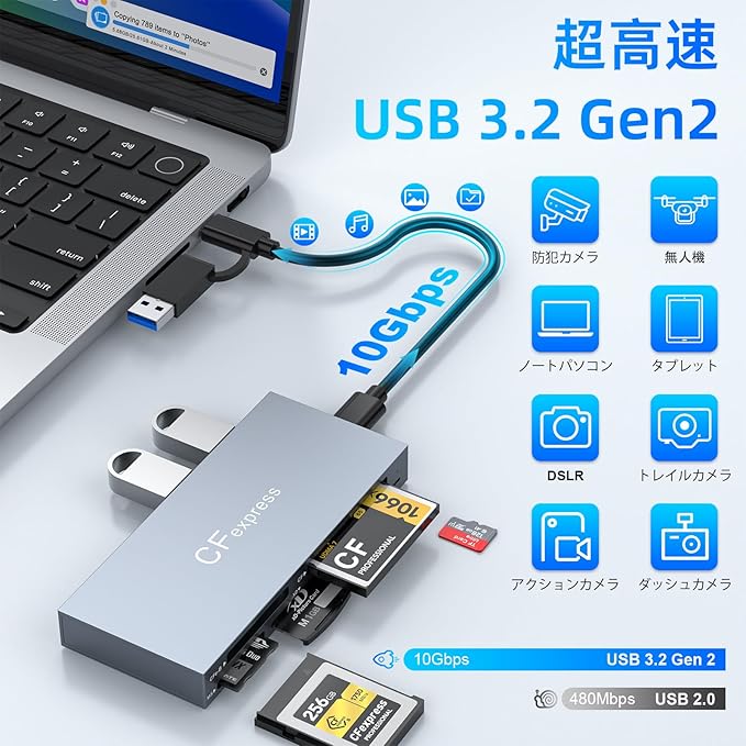 【超高速 10Gbps データ転送】最新規格 USB 3.2 Gen2 テクノロジーを採用(USB 3.1 Gen1 と下位互換性あり)により、メモリカード・USB 接続機器とのデータ転送速度を最大 10Gbpsに達成。大容量の動画、高画質写真、音楽、書類データまで、スムーズかつ短時間で転送可能です。本体に搭載された LED インジケーターにより、接続状態をリアルタイムで確認でき、作業の状況を一目で把握できます。