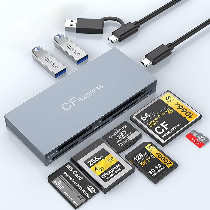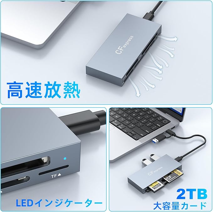 【幅広い互換性】CFexpress Type B/SD(SD/SDXC/SDHC/RS-MMC)/TF(microSD/microSDXC/microSDHC)/CF(CF I/HS CF/CF Elite Pro)/MS(MS Pro/Pro-Duo/Pro-HG)/XDカードに対応。最大2TBのCFexpressカードとUSBストレージデバイスの読み取りをサポート。Mac/Chrome OS/Linux/Android/Windows XP~11以降のOSでドライバ不要。