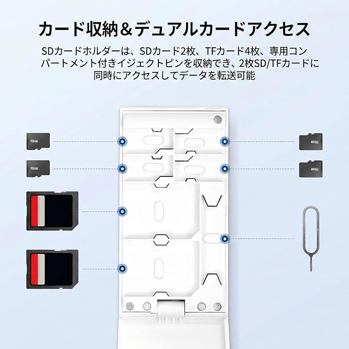 【カード収納&デュアルカードアクセス】SDカードホルダーは、SDカード2枚、TFカード4枚、専用コンパートメントを備えたイジェクトピンを収納でき、2枚SD/TFカードに同時にアクセスしてデータを転送できます。