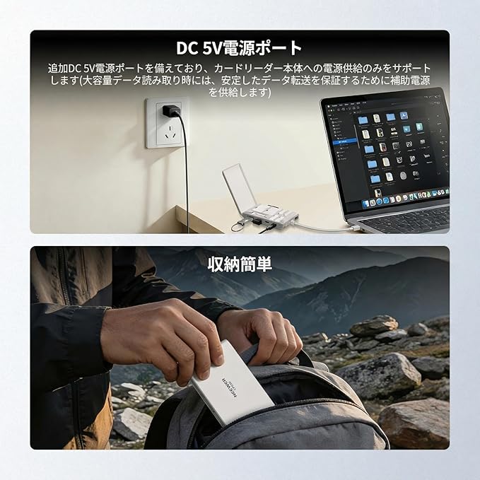 【USB A&USB C ハブ】カメラメモリカード用カードリーダーは、USB Aポート2つ、USB タイプCポート1つ、SDカードスロット1つ、TFカードスロット1つ、5V DC入力(カードリーダー充電専用)を備えており、キーボード、マウス、フラッシュドライブなどを簡単に接続して拡張できます。