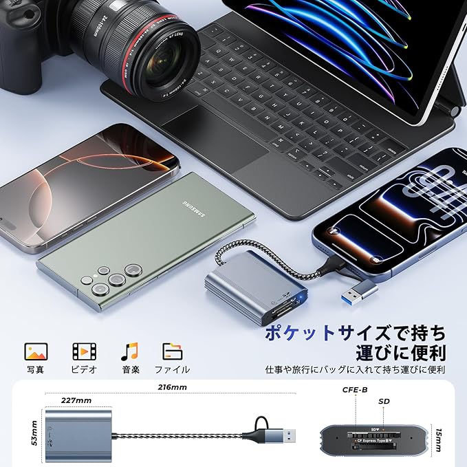 【プラグアンドプレイ】追加のドライバーやソフトウェアのインストールは不要です。このcf sd カードリーダーーをデバイスに接続するだけで、すぐにファイルの転送を開始できます。最大 2TB のカード容量をサポートし、すべての cfexpress タイプ b および SD カメラカードと簡単に互換性があります。写真/ビデオをデバイスに簡単かつ迅速に転送し、カメラの画像/ビデオをどこからでもソーシャルメディアで共有できます。外出先でもデジタルコンテンツを簡単に管理できます。