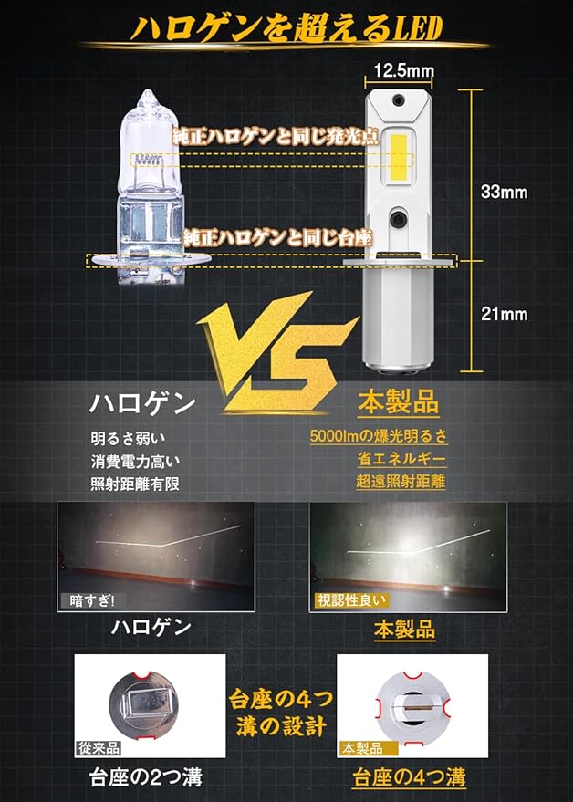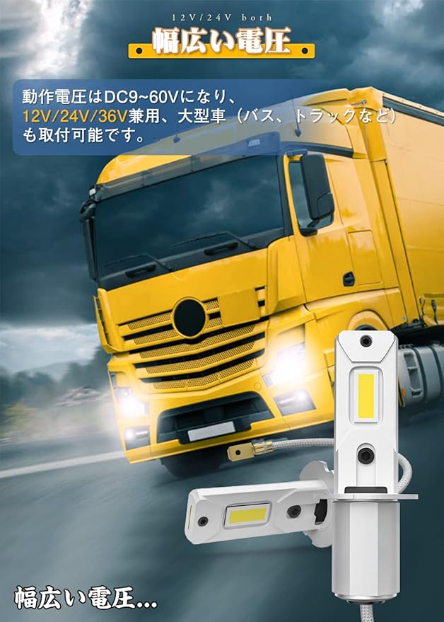 【取り付け簡単&車・トラック兼用】●ほぼ純正ハロゲンサイズ、アルミ台座も純正と一致する、一体型設計で面倒な配線加工は一切なし、取り付けも超簡単!初まるで純正ハロゲンをそのまま交換しているような装着感を実現、ポン付けで装着が更に楽になりました。初心者も簡単に取り付け可能です!明るく、快適、安全なドライビングをお楽しみください。●ノイズキャンセラー内蔵、無極性設計、動作電圧はDC9V~60Vまでのワイドレンジになり、12V/24V/36V兼用、大型車(バス、トラックなど)も取付可能です。定電路回路&過電圧保護回路を搭載しているので、ハイブリッド車・EV車にも安心してご使用いただけます。