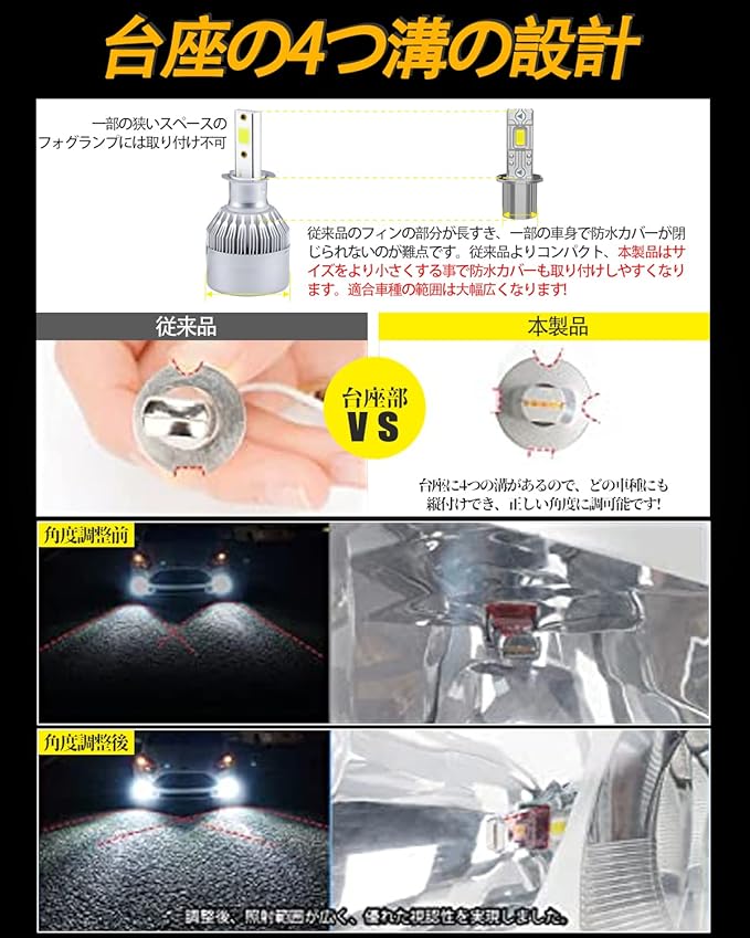 【台座の4つ溝の設計】H3LEDフォグランプの台座には4つの溝があるので、縦レイアウトと横レイアウトが可能にできます。H3 LEDフォグランプ、最適な角度に調整して、純正同様の配光が出られ、他の車に迷惑をかけません。製品はサイズをより小さくする事で防水カバーも取り付けしやすくなります。適合車種の範囲は大幅広くなります!