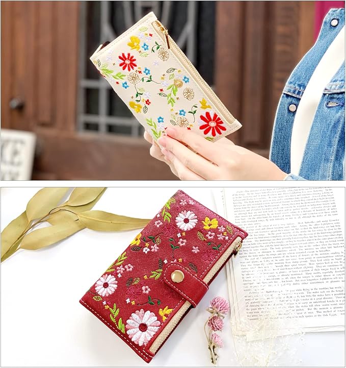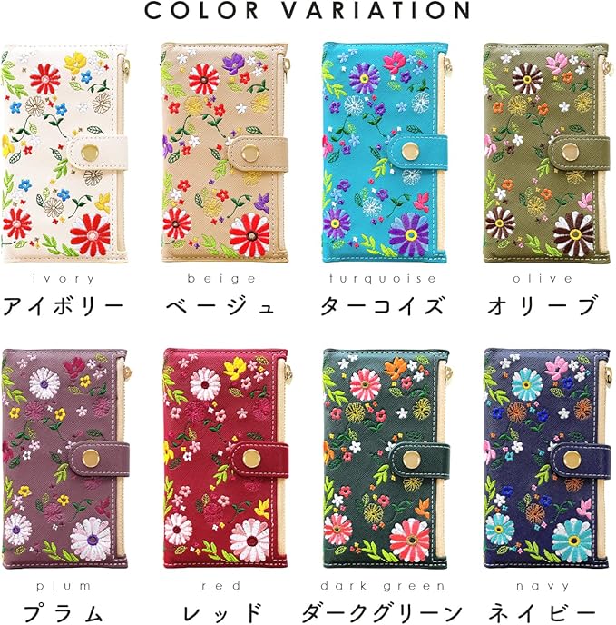 Google Pixel 9a 専用 手帳型ケース。小銭や免許証等の収納に便利なファスナー付きの手帳型ケースです。上品なサフィアーノ生地に、色鮮やかな花柄の刺繍を施しています。