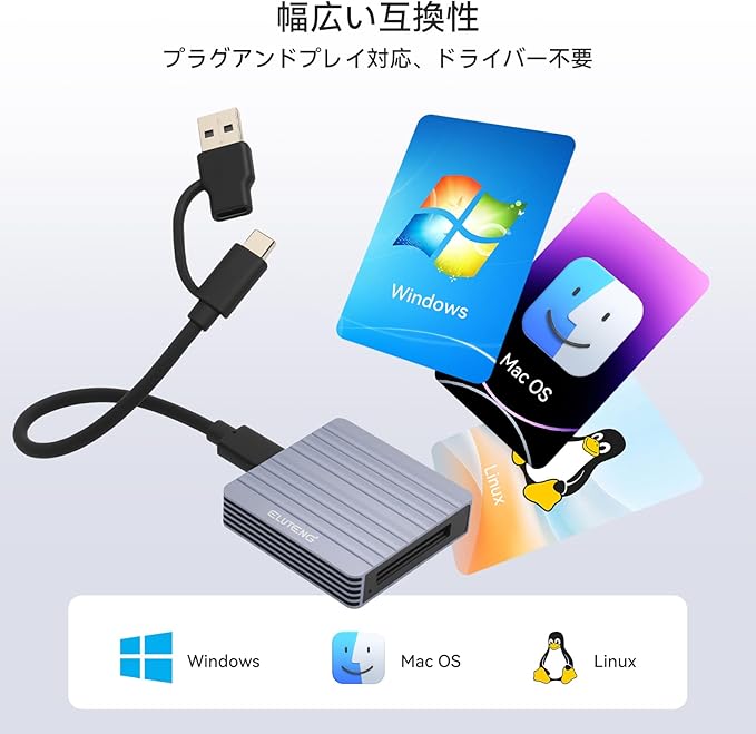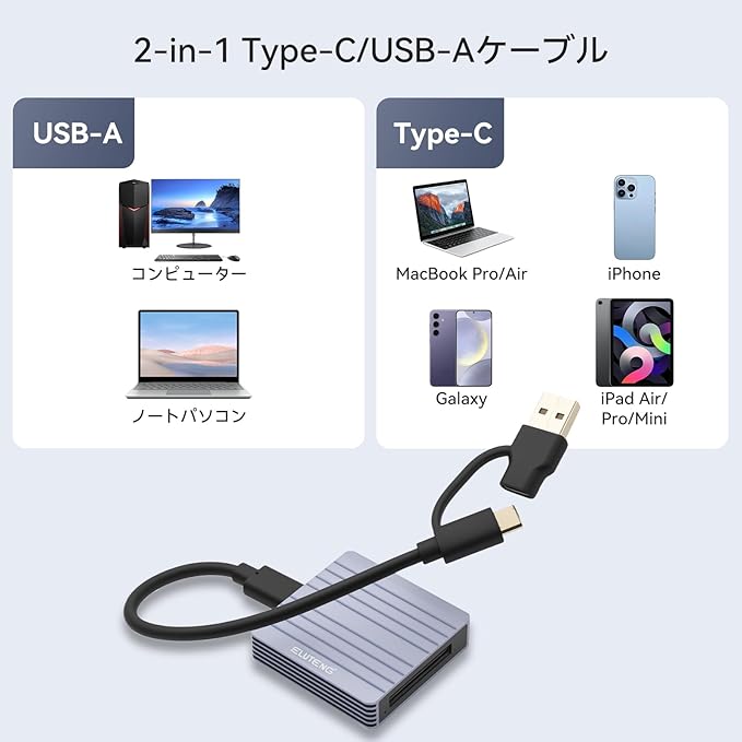 【マルチデバイス・マルチシステム対応】デスクトップPC、ノートパソコン、タブレット、スマートフォンなど、このカードリーダーは非常に幅広いデバイスとの互換性を提供します。さらに重要なのは、Windows、Mac OS、Linux など複数の OS に対応し、異なるプラットフォーム間でシームレスに動作し、OS とデバイス間の垣根を完全に取り除くことです。付属の Type-C/USB-A 2-in-1 データケーブルにより、デバイス間の互換性がさらに向上し、新旧両方のデバイスに簡単に接続して使用できます。