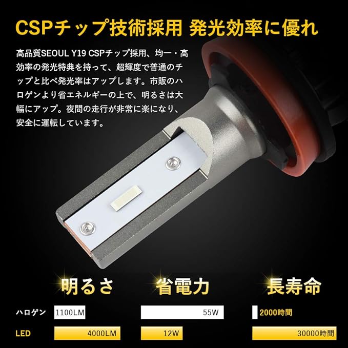 【発光効率に優れ】高品質SEOUL Y19 CSPチップを採用し、より効率のいい発光となりました。ハロゲンバルブの配光特性を更に追及。他車へ幻惑を与えない正確な配光を生み出し、広範囲な配光で路面を確実に照らす高い路面照射精度を実現しています。市販のハロゲンより省エネルギーの上で、明るさは大幅にアップ。