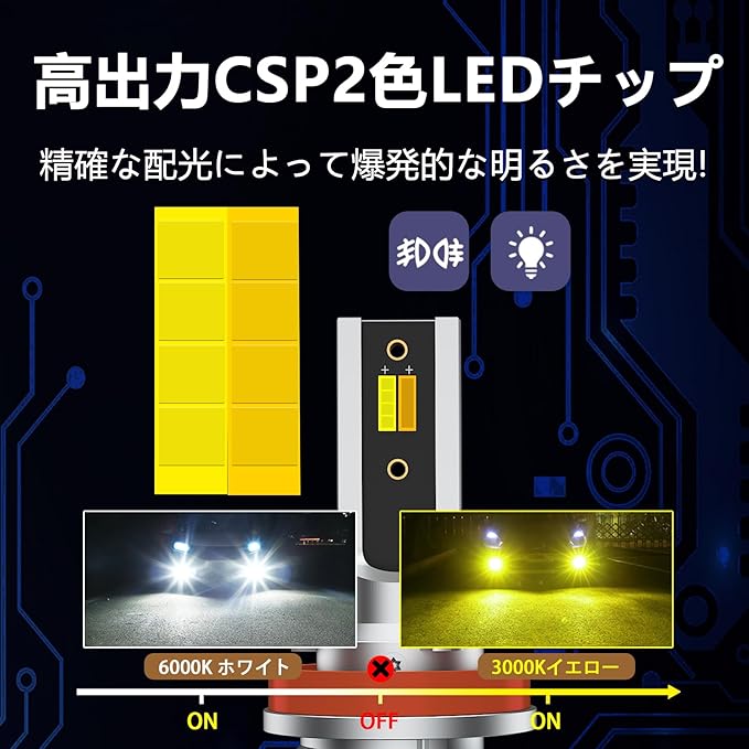 ✅【高輝度2色CSP LEDチップ】一流メーカー製の高輝度2色CSP LEDチップ搭載、安定性がよくて、高いの視認性、車の一台分合計14000LMのルーメンを実現!ハロゲンより400%以上の明るさ!!ホワイトとイエローの2色カラーチェンジの仕様で、車検基準も対応しています。夜間の走行が非常に楽に運転しています。