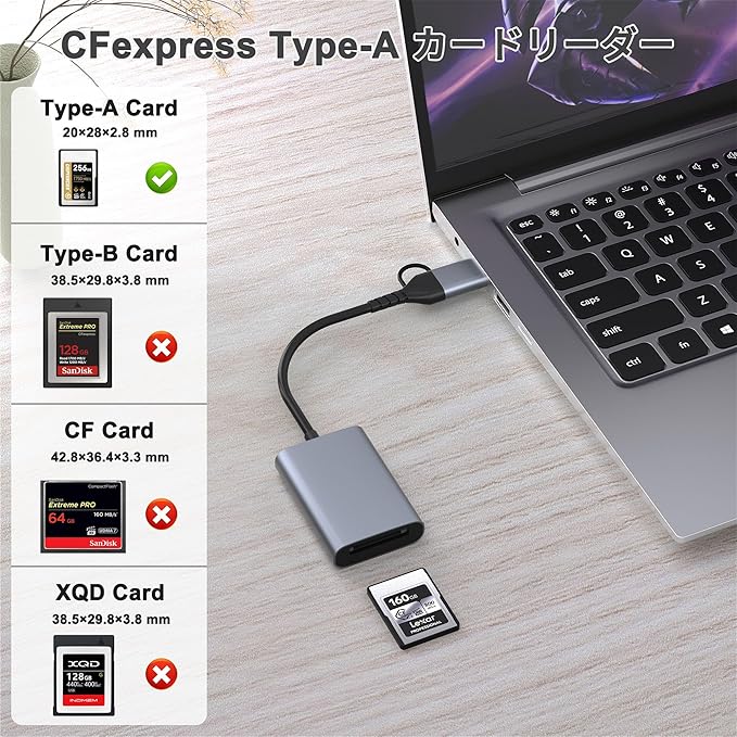 プロフェッショナルCFexpressタイプAカードリーダー: このカードリーダーは、CFexpress(タイプA)メモリカード用に特別に設計されています。写真やビデオ撮影を愛し、CFexpressカードを使用する人々に大きな利便性を提供します。特に、プロブロガー、インフルエンサー、写真家、映像作家、ビデオグラファーに最適です。