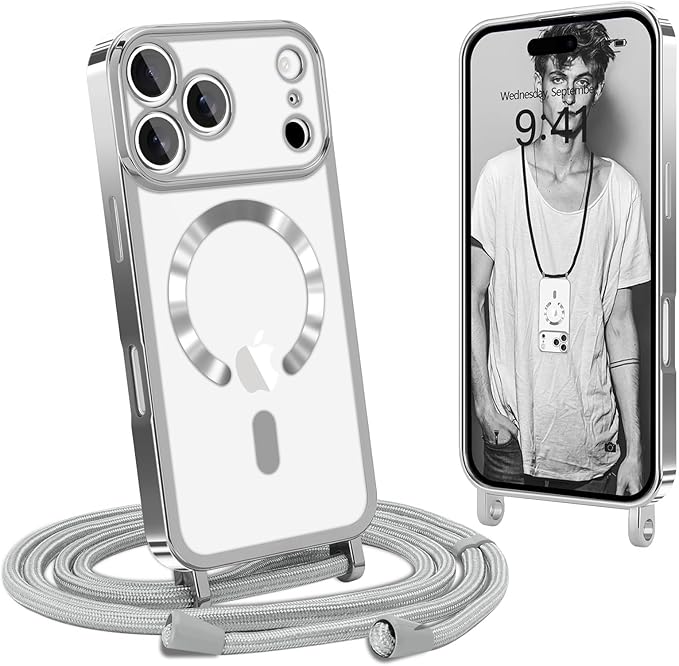 Lafunda iPhone 17 Pro Max 用 ケース クリア MagSafe対応 ショルダー スマホカバー 透明 肩掛け 斜めかけ 縄掛け TPU 薄型 おしゃれ マグネット搭載 耐衝撃 落下防止 長さ調整可能 ワイヤレス充電 アイフォン 17 Pro Max 用 携帯スマホケース ストラップ付き (シルバー)