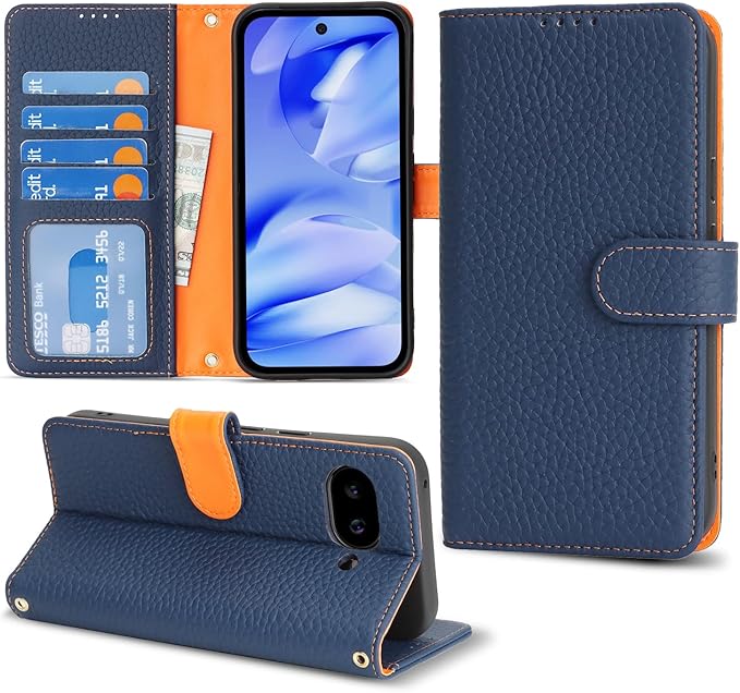 対応 Google Pixel 9a ケース 手帳型 グーグルピクセル9a ケース 本革 カード収納 スタンド機能 ピクセル9a ケース 大容量 財布型 耐衝撃 pixel 9a スマホケース レザー ブルー と オレンジ