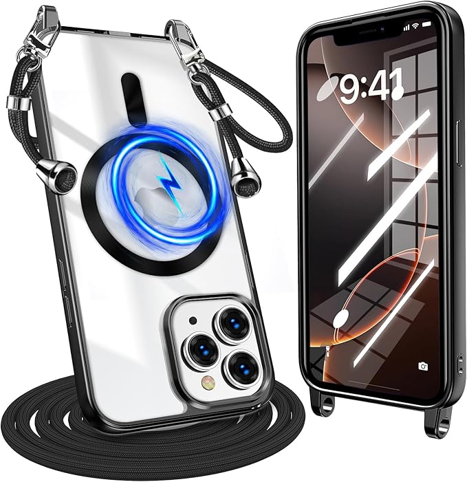 iPhone 16 Pro Max 用 ケース クリア ショルダー 耐衝撃 アイフォン 16 プロ マックス 用 ケース Magnetic対応 ストラップホール付き 肩掛け 紐付き TPU 斜めかけ 縄掛けケース 長さ調整可能 取り外し可能 落下防止 紛失防止 軽量 一体型 ワイヤレス充電対応 メッキ加工 アイフォン 用 カバー 黒 W-CXKS-10-01
