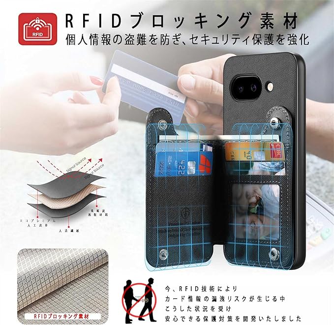 対象機種 : Google Pixel 9a, Googleピクセル9a, ピクセル9a 2025カードポケットは非接触式スキミング防止加工済みです。スワイプ時にカードを取り出す必要があり、スリーブに入れて使用することはできませんのでご注意ください