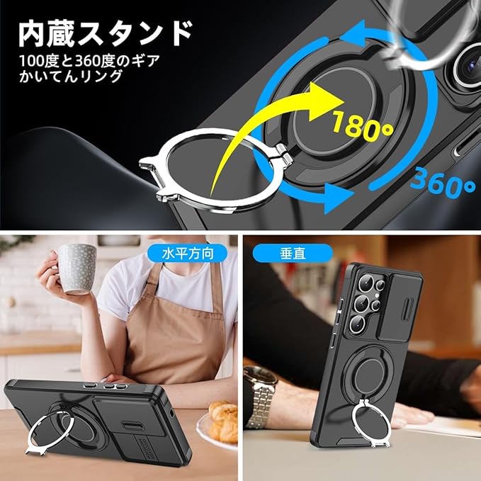 【スタンド機能】360度回転スタンド:スタンドはスマホケースの溝に嵌め込まれ、場所を取らず、平らに収納できます。縦置きまたは横置きのどちらかを選択し。水平スタンド機能を使用して、お好みの角度でビデオを見ることができます。新幹線や飛行機での長時間の移動中の暇つぶしに利用できます。