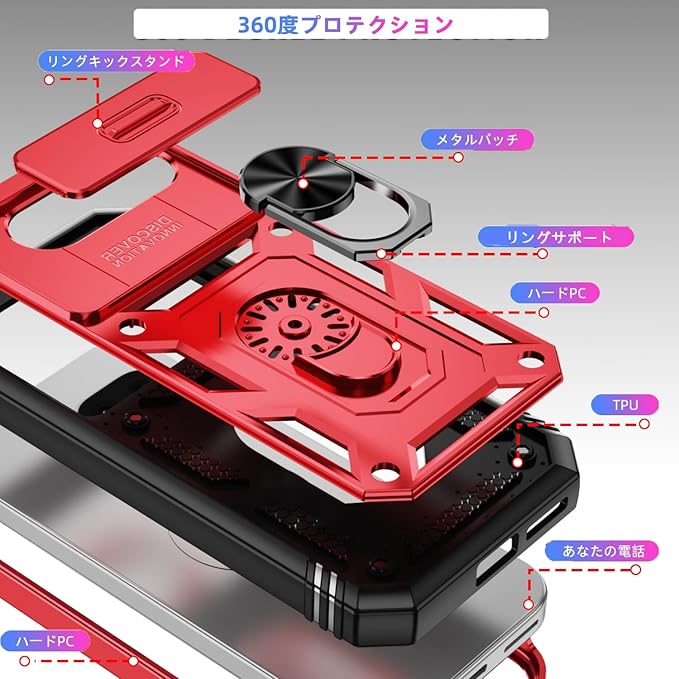 【スタンド機能&内蔵マグネット】360度回転スタンド、動画視聴にも、45 ℃角度調節自由自在に使, 一番最高の視角で鑑賞の同時ににお手を解放できます。金属製のリングと内装の金属フィルムは、車載の磁気吸盤にしっかりと吸着することができ、運転中に携帯電話のナビゲーションなどの機能をより便利に使用することができます。