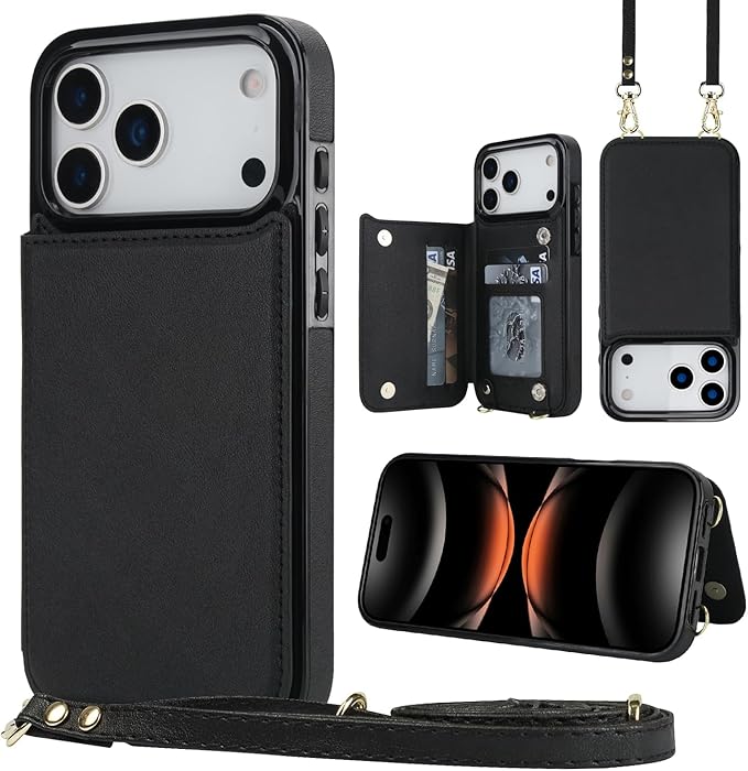 適用 iphone 17 pro Max ケース ショルダー 窓口式 カード入れ スマホケース ストラップ付き アイフォン17プロマックス カバー 手帳型 斜めがけ 可愛い iphone17proMax ショルダーケース 首かけ 肩掛け かわいい おしゃれ RFIDスキミング防止機能 ロング クロスボディ 携帯カバー ブラック